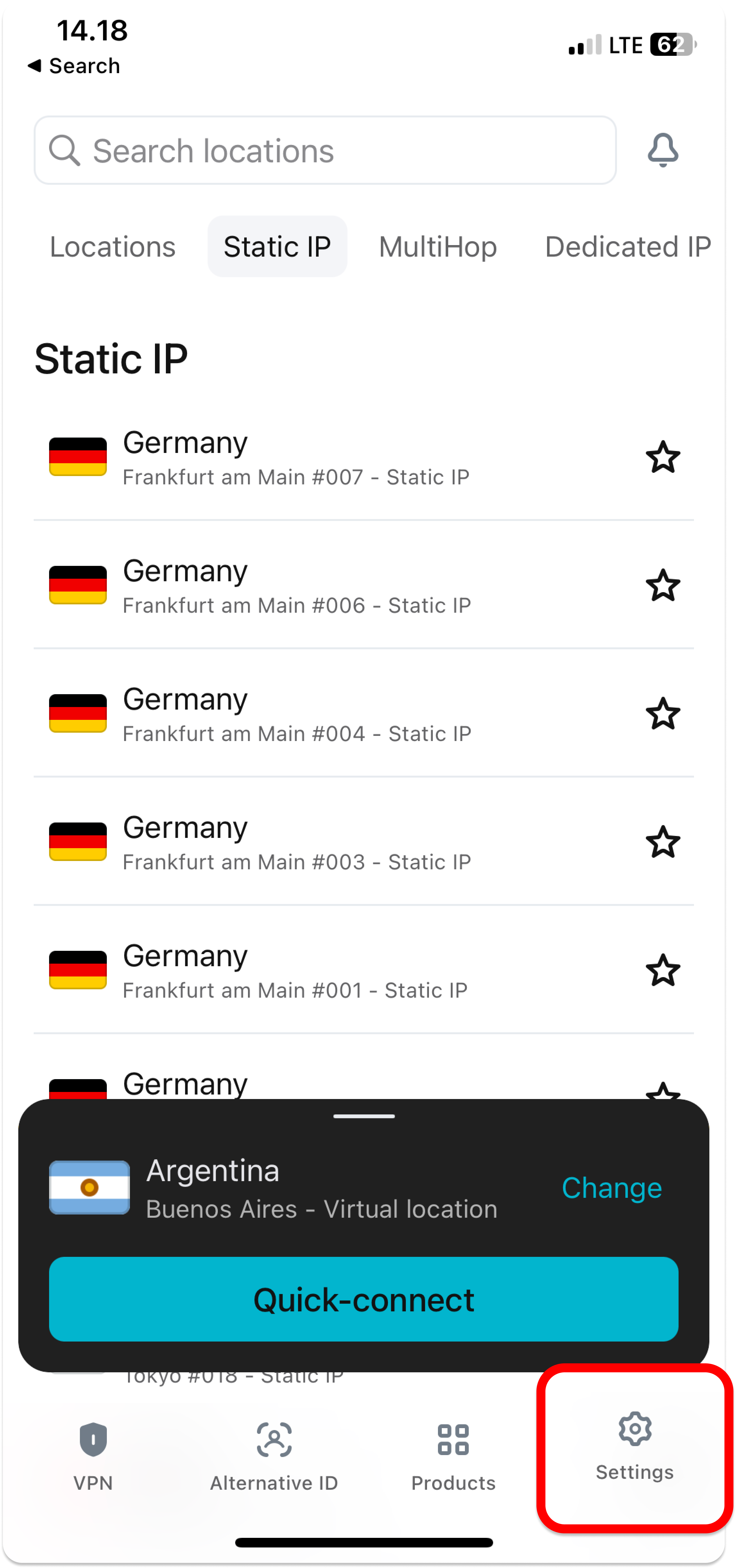 1. Open the Surfshark application and tap Settings on the bottom bar.