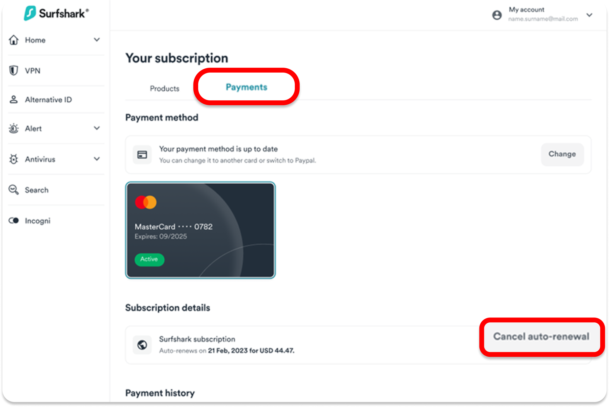 NOTE: Cancelling your subscription's auto-renewal does not automatically grant a refund – it stops your subscription's auto-renewal and recurring payments. If you purchased our services within the last 30 days and wish to receive a refund, please refer to our article on Surfshark refund policy.