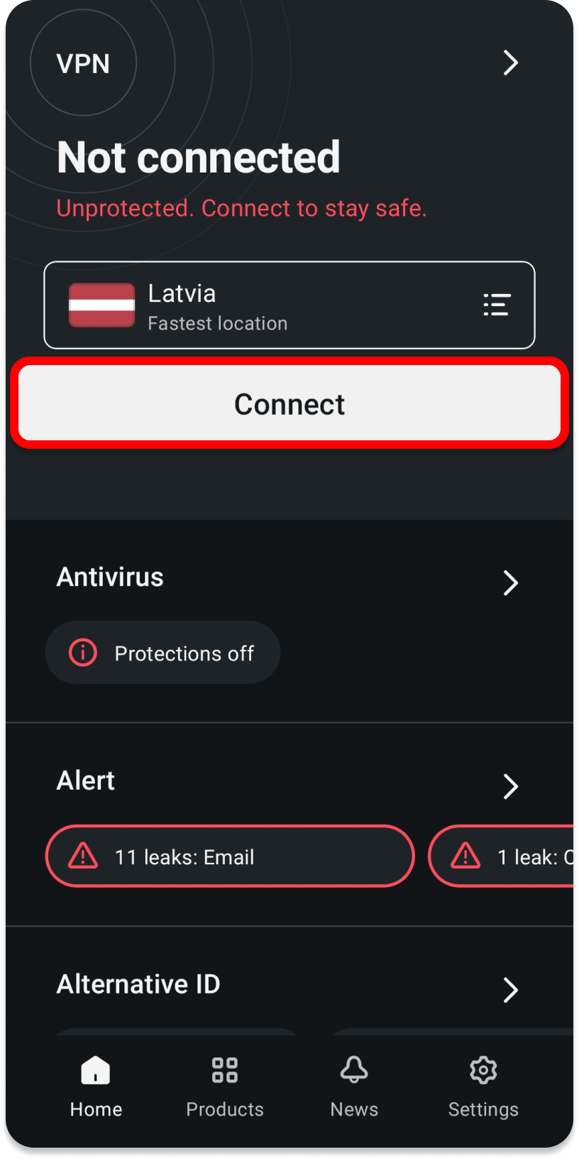 You can start by tapping Connect. By default, your app will connect you to the fasted available location.