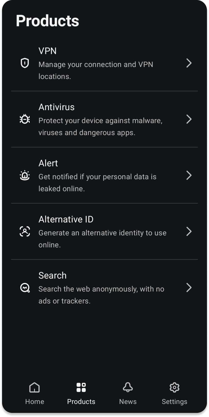 Open the Products section in your Surfshark app. Besides VPN, you can see 4 of Surfshark's additional features. To use them, you have to have an active Surfshark ONE subscription: