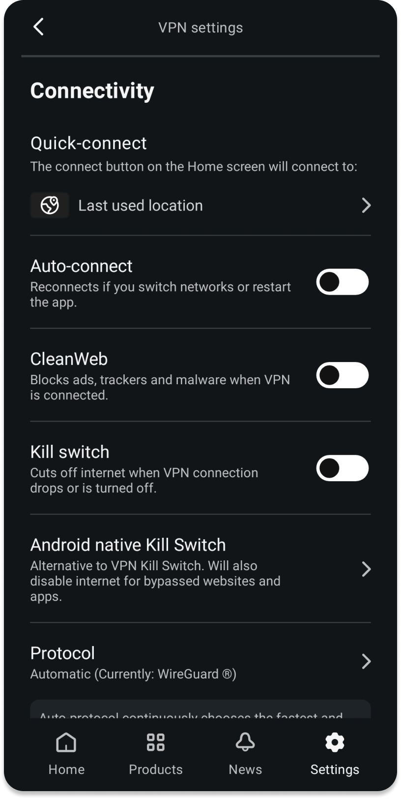 - Enable KillSwitch. It's a feature that protects you from unexpected VPN disconnections.